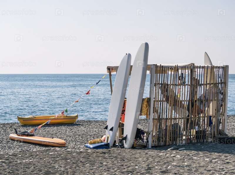 Арендная станция SUP с оборудованием для серфинга и аксессуарами на пляже на фоне синего моря