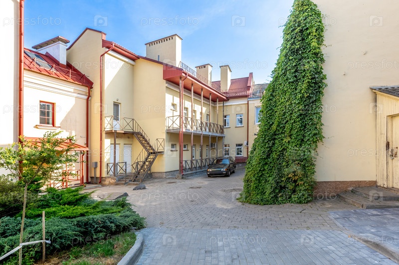 Яркий жилой двор с желтыми зданиями, металлическими лестницами, зеленью, стеной, покрытой плющом и припаркованным автомобилем в ясную солнечную погоду