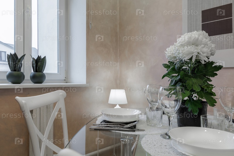Стильный обеденный стол с цветами, посудой, тарелками и мягким освещением возле окна