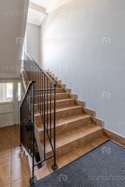 Яркий интерьер лестницы с закрученными ступенями и металлическими рельсами