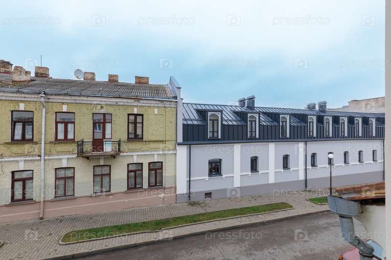 Вид на старые жилые здания и отремонтированный фасад вдоль тихой городской улицы