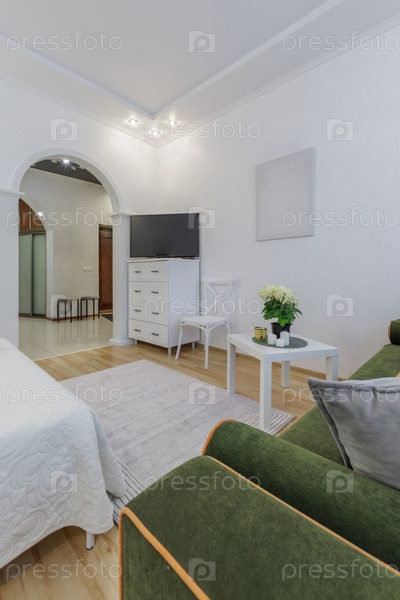 Яркий интерьер гостиной с аркой, современная мебель, мягкое освещение и уютный декор