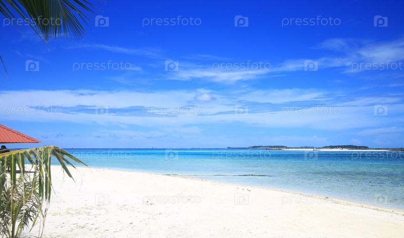 Пляж, песок и голубое небо с облаками на курорте в океане
