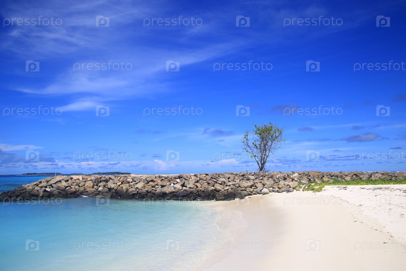 Пляж, песчаный берег и голубое небо с облаками на курорте в океане