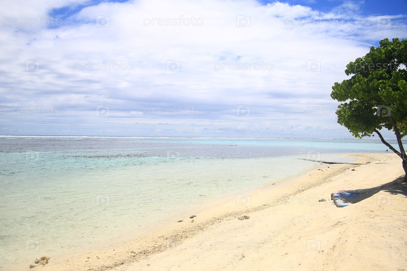 Пляж, песчаный берег и голубое небо с облаками на курорте в океане