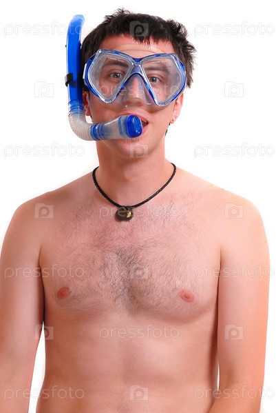 Парень в маске для подводного плавания крупным планом на белом фоне