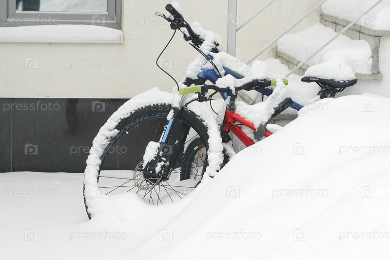 Два велосипеда, покрытых снегом, стоят в глубоком снегопаде возле дома