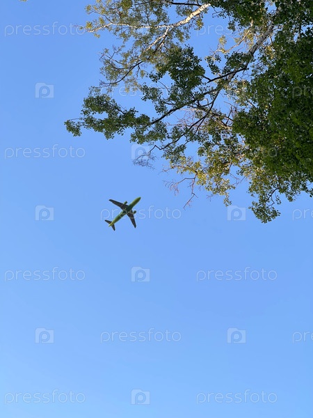 Самолет в небе против дерева летом