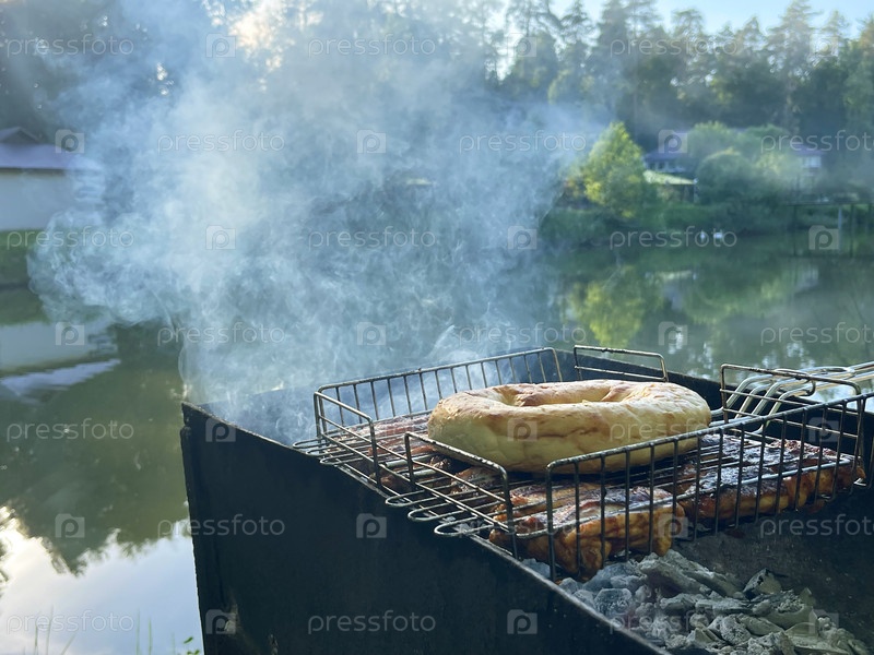 Мясо и свежий хлеб пита на жарке над горящими углями
