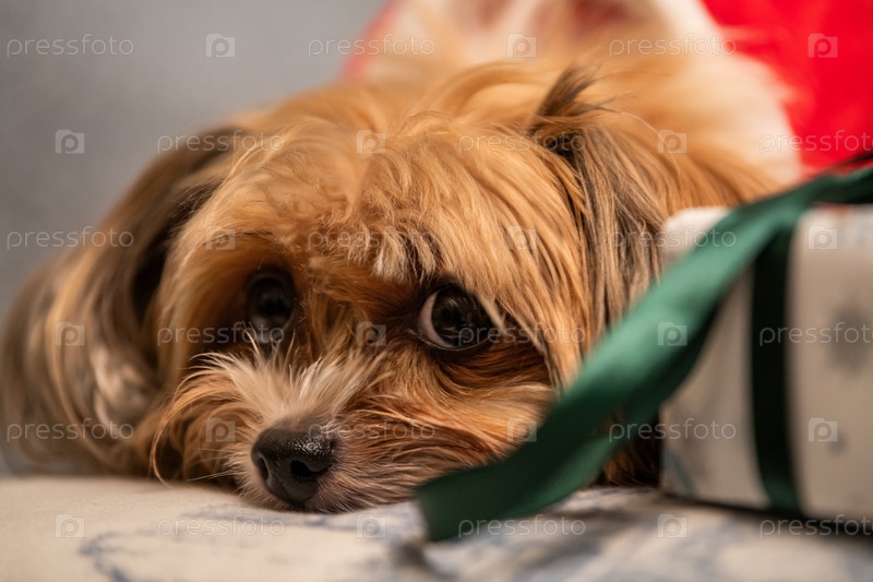 Милый йоркширский терьер на одеяле смотрит в камеру с подарком, завернутым в зеленую ленту