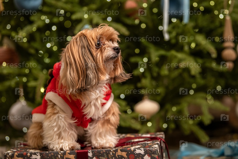 Милая собака в рождественском костюме празднует праздничный сезон. Праздничное животное на подарочной коробке с размытым фонам елки