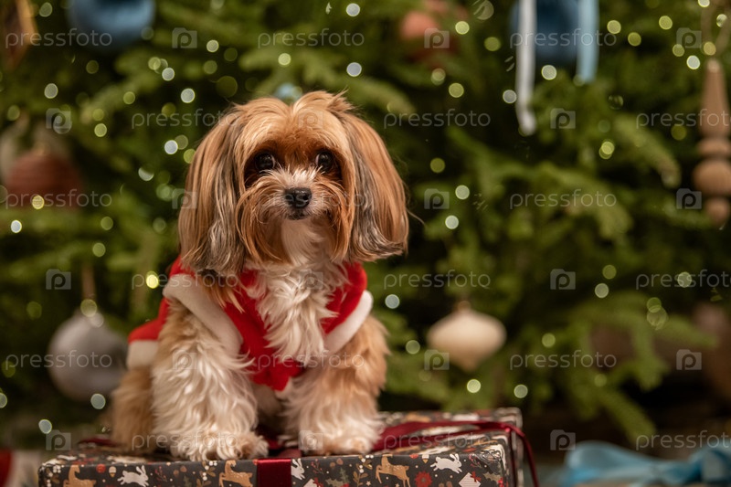 Милая собака в рождественском костюме празднует праздничный сезон. Праздничное животное на подарочной коробке с размытым фонам елки