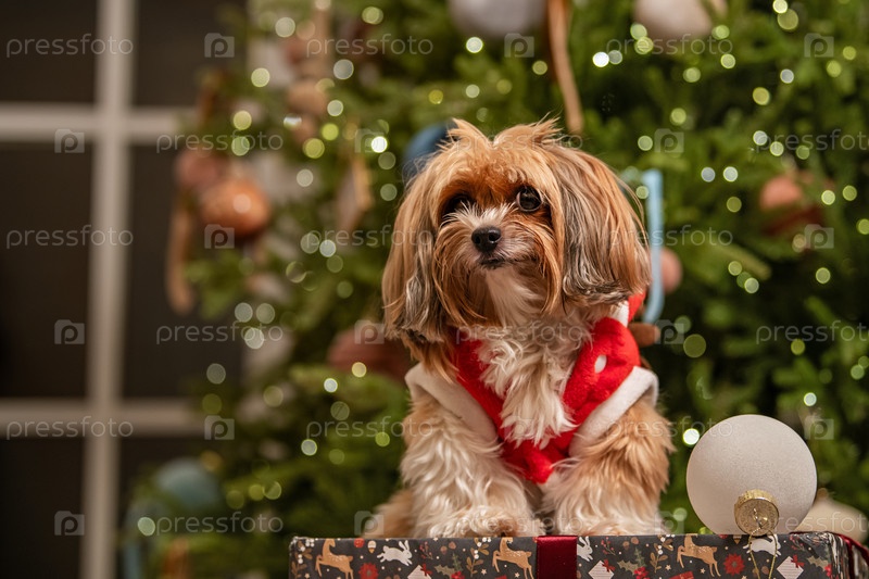 Милая собака в рождественском костюме празднует праздничный сезон. Праздничное животное на подарочной коробке с размытым фонам елки