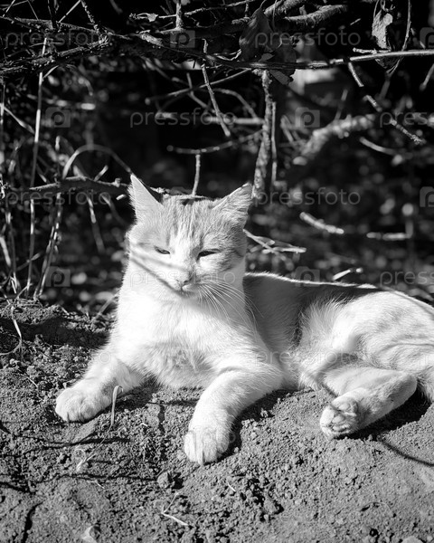 Котенок лежит в саду из земли, чёрно-белая фотография