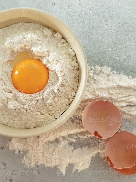 Яичный желток на муке в миске со сломанными яичными скорлупами, сфотографированный смартфоном