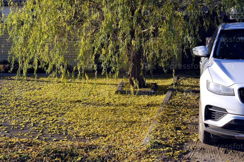 Белая машина под падающей иловой краской осени.Россия Воронежская область 16 ноября 2025