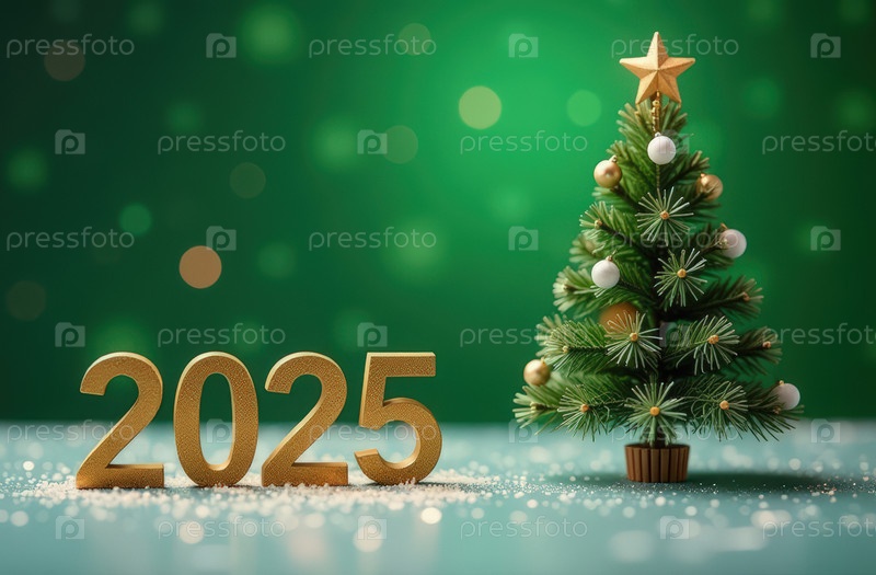 Золотые фигуры 2025 рядом с рождественской елкой на зеленом праздничном фоне с пространством для текста