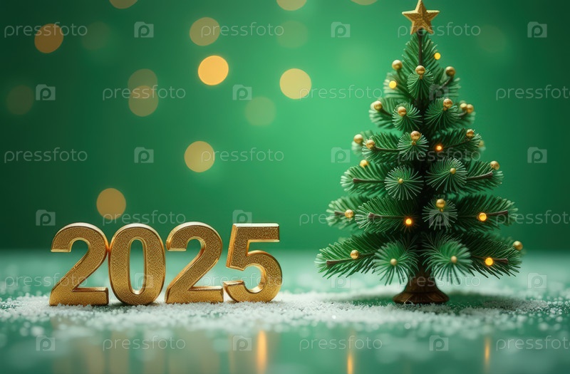 Новогодняя открытка с цифрами 2025 и рождественская елка в золотом и зеленом цветах с боком и копировальным пространством