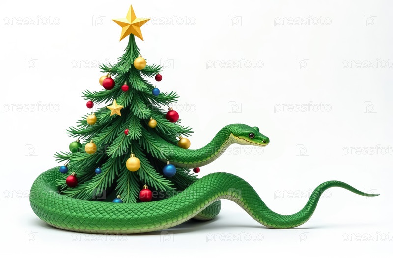 Зеленая змея обернулась вокруг украшенной рождественской елки на белом фоне