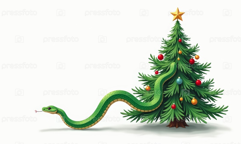 Большая зеленая змея ползает из рождественской елки на белом фоне