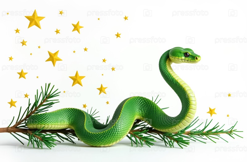 Зеленая змея ползет вдоль ветви елей на белом фоне с желтыми звездами
