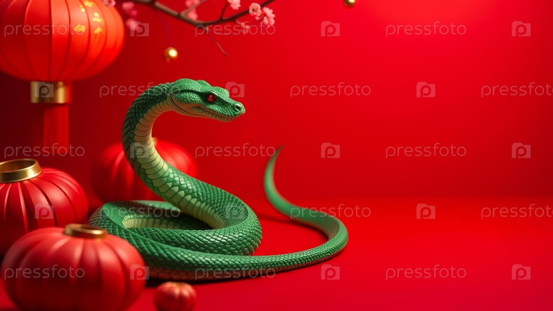 Зеленая змея, свернутая на красном фоне со копировальным пространством и разбросанными вокруг красными фонарями - традиционным символом китайского Нового года