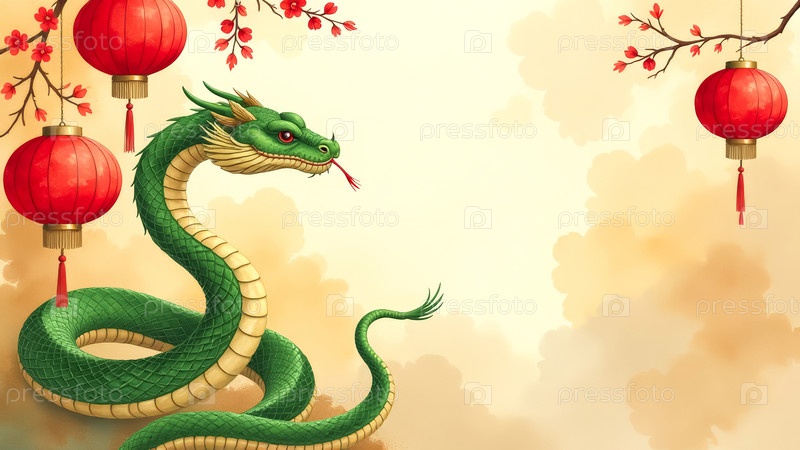 Зеленый дракон или змея среди цветов и красные китайские фонари на золотом фоне, поздравляю с Китайским Новым годом