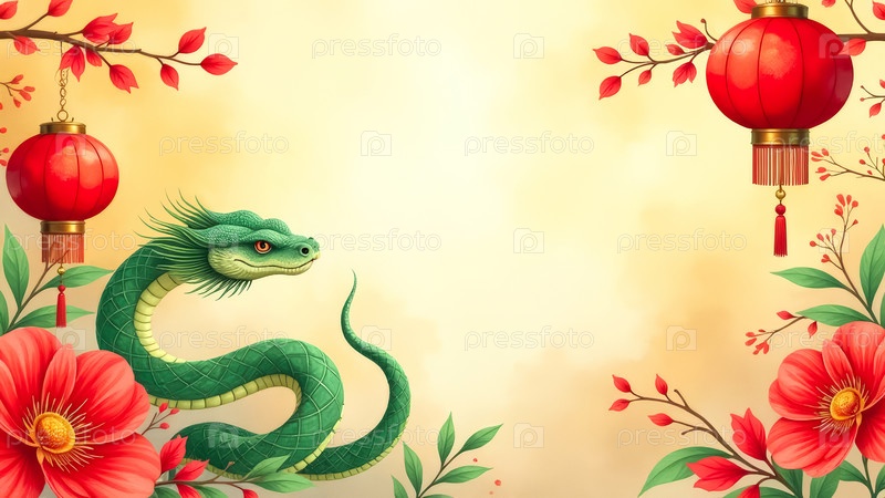 Зеленый дракон или змея среди цветов и красные китайские фонари на золотом фоне, поздравляю с Китайским Новым годом