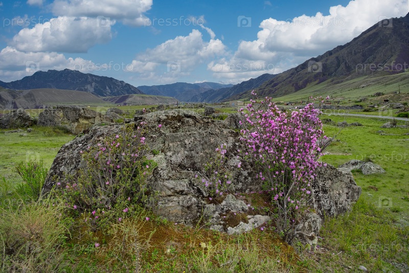 Россия.Алтайские горы.Цветящий куст рододендрона ледебура (маралника) на скалистых склонах гор вдоль Чуйского тракта возле деревни Купчеген