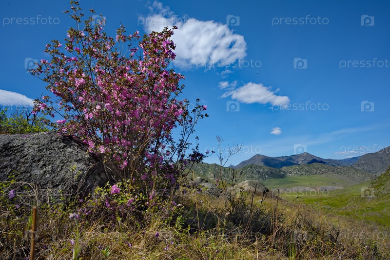 Россия.Алтайские горы.Цветящий куст рододендрона ледебура (маралника) на скалистых склонах гор вдоль Чуйского тракта возле деревни Купчеген