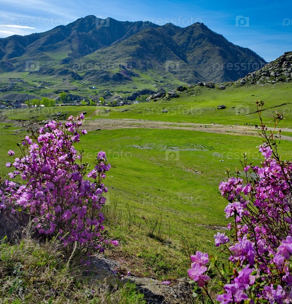 Россия.Алтайские горы.Цветящий куст рододендрона ледебура (маралника) на скалистых склонах гор вдоль Чуйского тракта возле деревни Купчеген