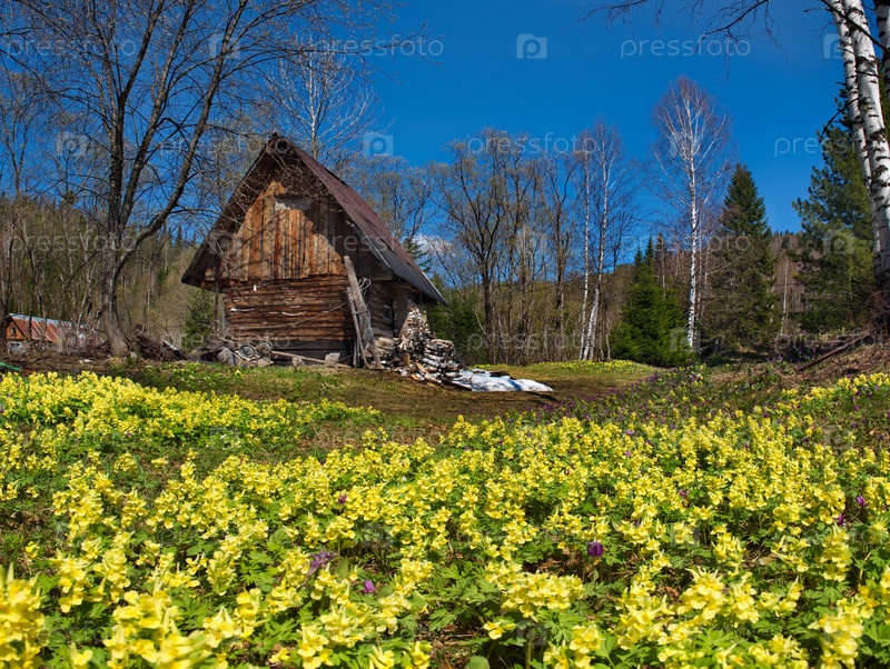 Юг Западной Сибири, Кузнецкий Алатау. кустарники цветущих весенних первоцветов, которые образуют желтый живой ковер в тайге долины реки Том