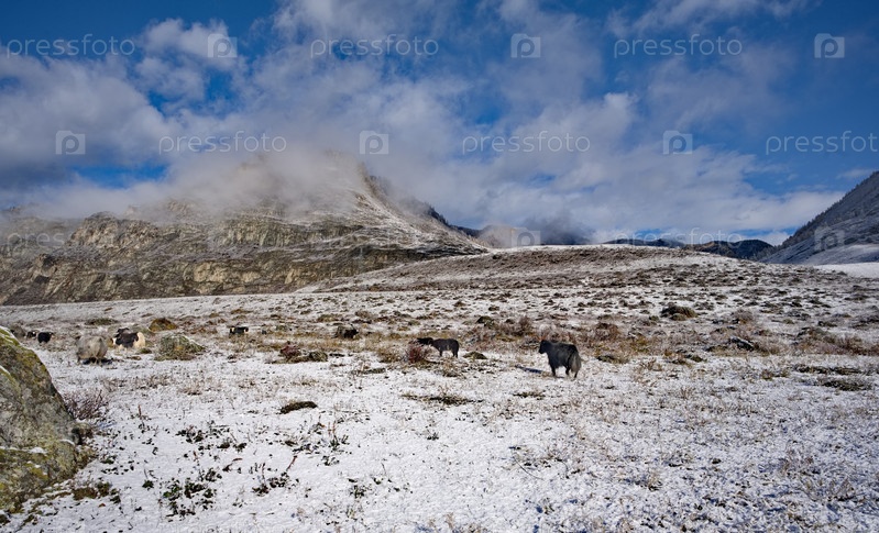 Южнее Западной Сибири, горы Алтай.Небольшое стадо длинношерстных якутов мирно пасется на снежном пастбище в долине реки Чуя недалеко от деревни Йодро