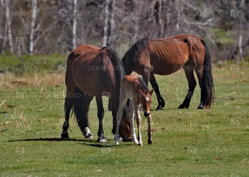 Россия. горы Алтай. мирно пасущиеся лошади с жеребцами на весенних горных степях вдоль Чуйского тракта