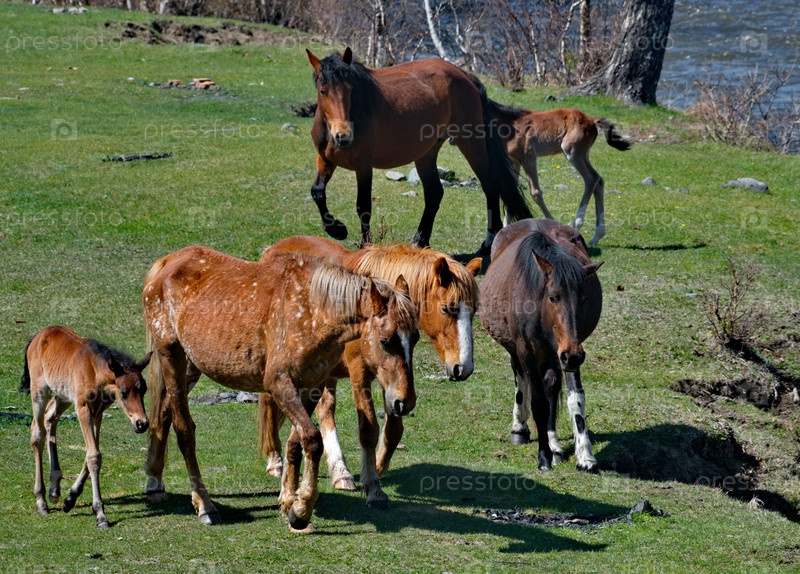 Россия. горы Алтай. мирно пасущиеся лошади с жеребцами на весенних горных степях вдоль Чуйского тракта