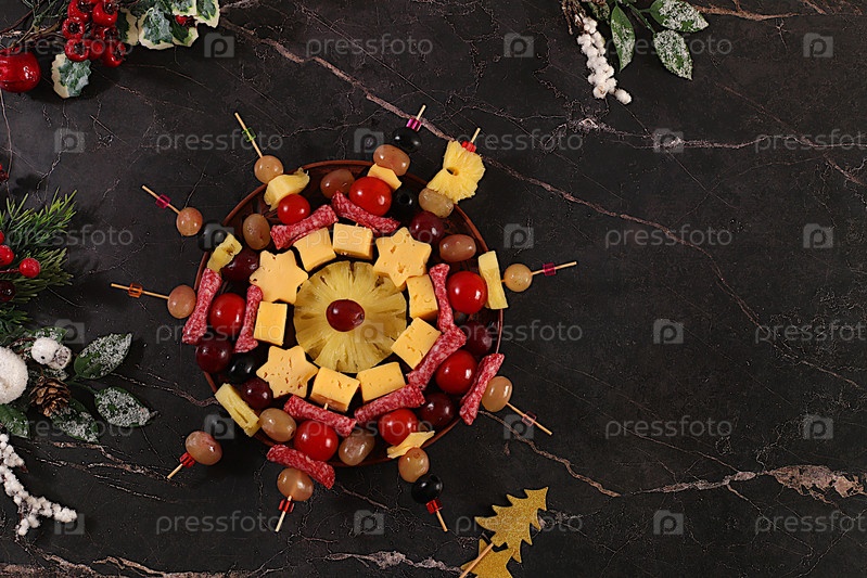 Ассортимент канапе с помидорами, сыром, салями, ананасами, оливками и виноградом на мраморном столе. рождественские и новогодние блюда, комплект закусок для праздничного буфета. концепция канун Рождества