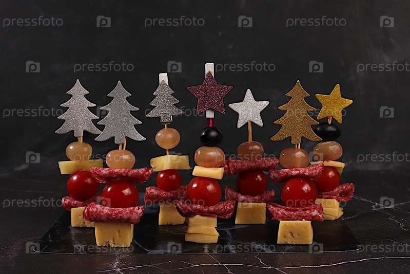 Диван с помидорами, сыром моцареллой, салами, оливками и виноградом на мраморном столе в канун Рождества.Рождественские и новогодние блюда, набор закусок для праздничного стола