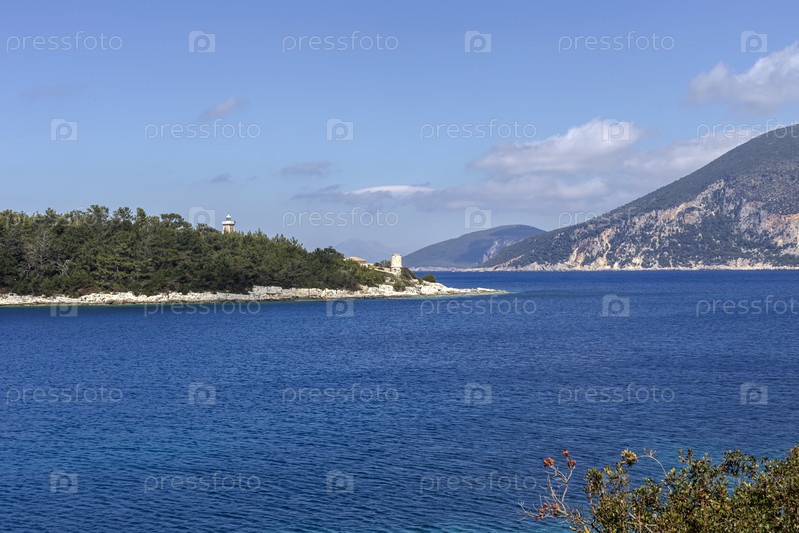 Старый каменный маяк (остров Кефалония, Греция) на фоне моря и гор