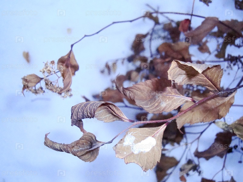 Сушеные осенние листья на ветке в снегу Минимализм зимой