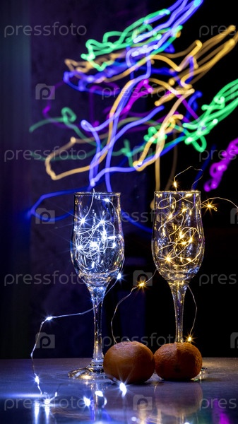 Праздничная инсталляция: мандарины, бокалы для шампанского с огнями