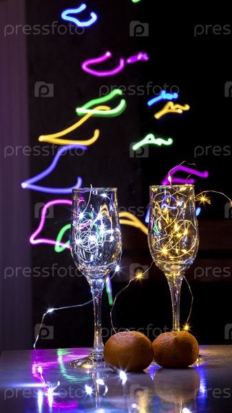Праздничная инсталляция: мандарины, бокалы для шампанского с огнями
