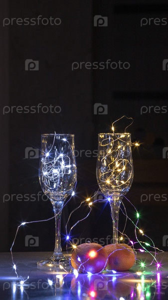 Праздничная инсталляция: мандарины, бокалы для шампанского с огнями