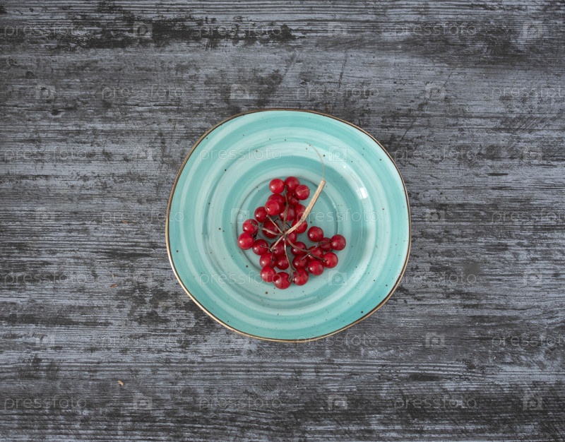 На бирюзовой пластине на деревянном фоне изображено скопление обыкновенных калин
