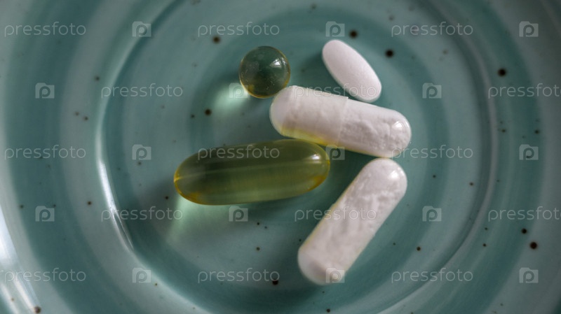 Таблетки и гелевые капсулы расположены на блюде