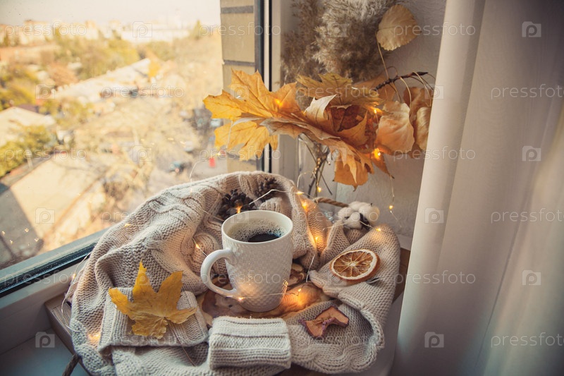 Уютный осенний натюрморт на подоконнике. кофейная кружка, окруженная свитерами и осенним декором: листья, сухофрукты, сосновые шишки, цветы