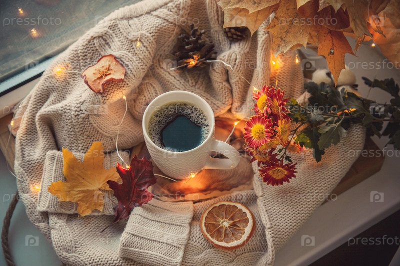 Уютный осенний натюрморт на подоконнике. кофейная кружка, окруженная свитерами и осенним декором: листья, сухофрукты, сосновые шишки, цветы