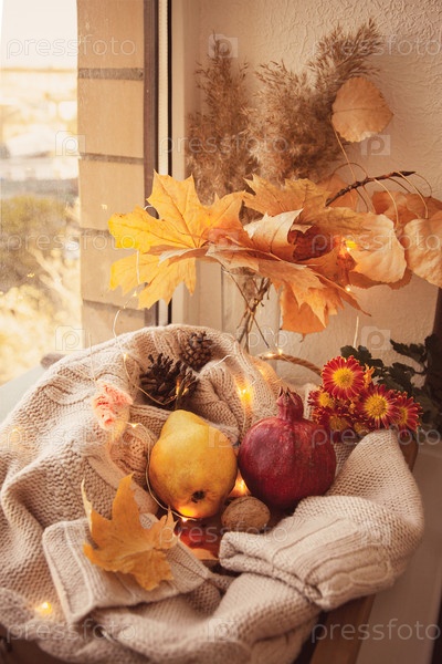 Осенний урожай: груша, гранат, орехи, осенние листья, астра цветы на шерстяном свитере