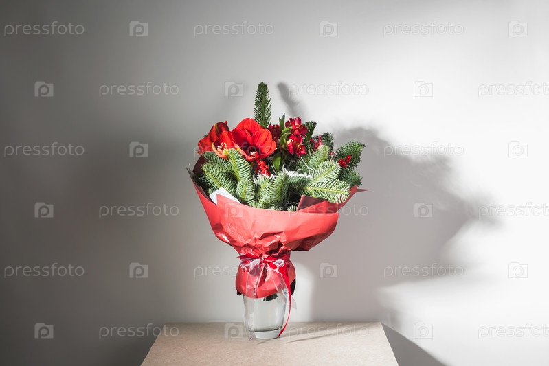 Большой и красивый зимний букет с амариллисами, ветвями сосны, альстромерией прикрепляется к белой стене