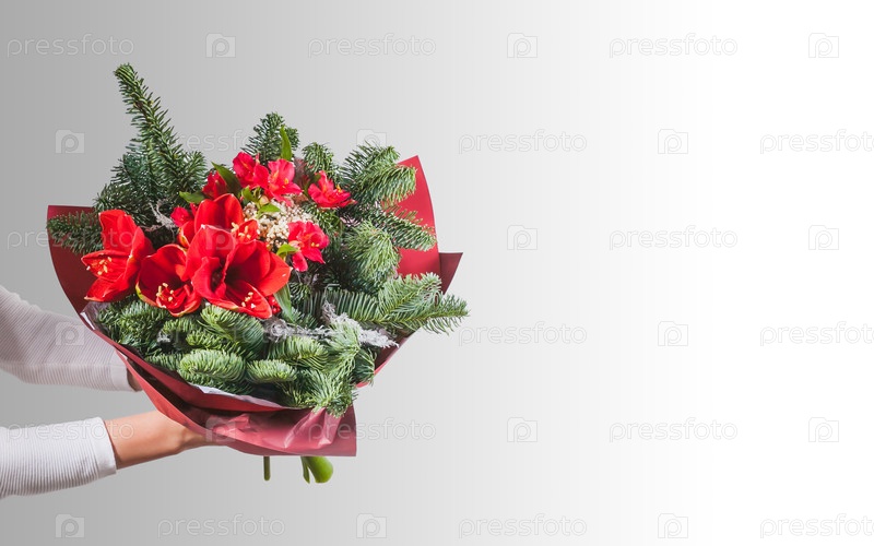 Женщина держит большой и красивый зимний букет с амариллисом, ветвями сосны, альстроэмерией