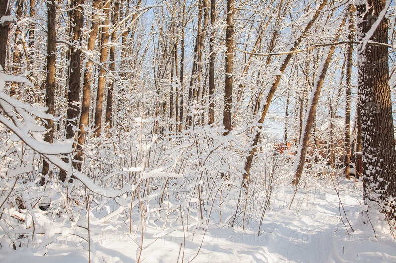 Закат солнца в зимнем лесу со снегом на деревьях в солнечный день